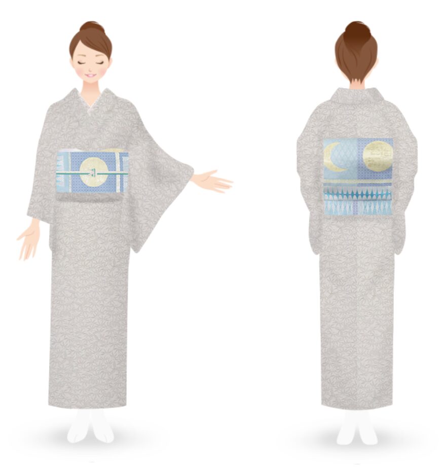シンプルモダンな「かぐや姫」のコーディネートです。竹文様の小紋に、月文様の帯。物語のモチーフで遊びながら、淡いトーンの色ですっきりとまとめてみました。 |